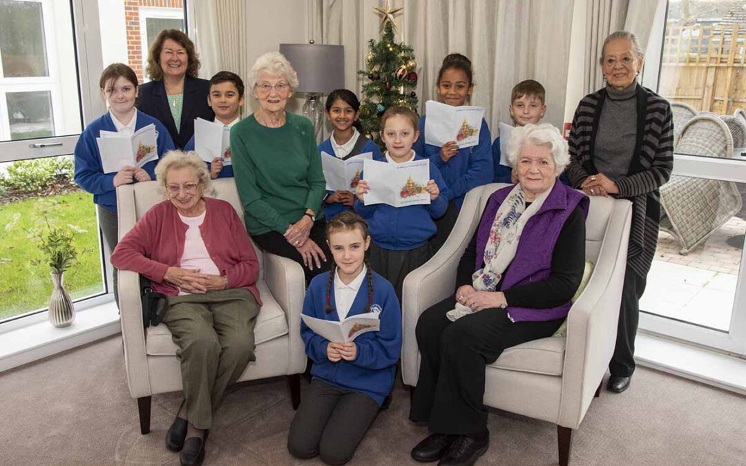 2 – Sales executive Jackie Spencer-Cavell with residents Joy Rivett, June English, Patricia Davis and Daphne Union and children from St Marys Farnham Royal C of E School. Dec 12, 2019