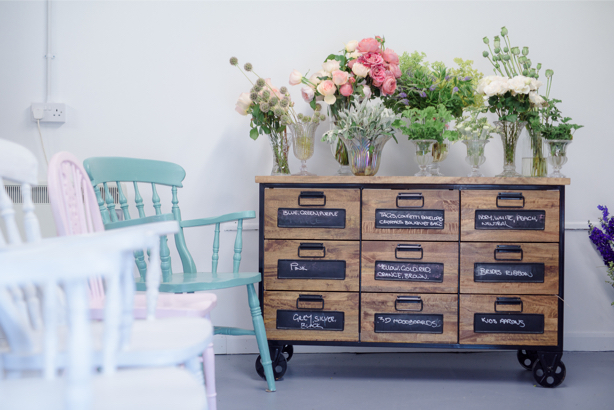 Each student has his/her own workstation and there is a lovely chest of drawers full of ribbons, string and embellishments to decorate the arrangements. The room is decorated in a clean shabby chic style and will comfortably accommodate about 10 students.