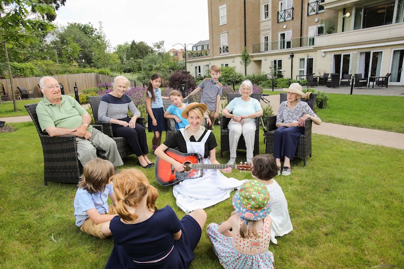 The pictures above feature the residents of Moore Place care home in Surrey with staff member Julia Laal starring as Maria from the Sound of Music and the children of the Bloo House School.