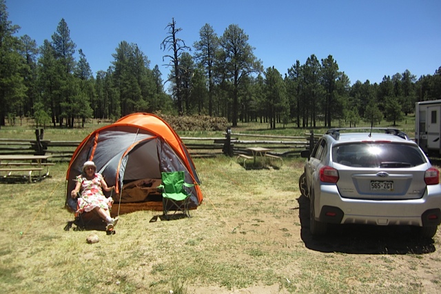 One large case had the tent, sleeping mats and camping gear. The other had the sheet, pillows and duvet from our bed, and my clothes. M’s packing was in the two carry-on bags. After landing at Denver airport from the Manchester flight we picked up a hire car which served as our 21st century trusty steed, then bought two fold-up chairs and a cooker ring that screws into a gas cylinder. We were off!