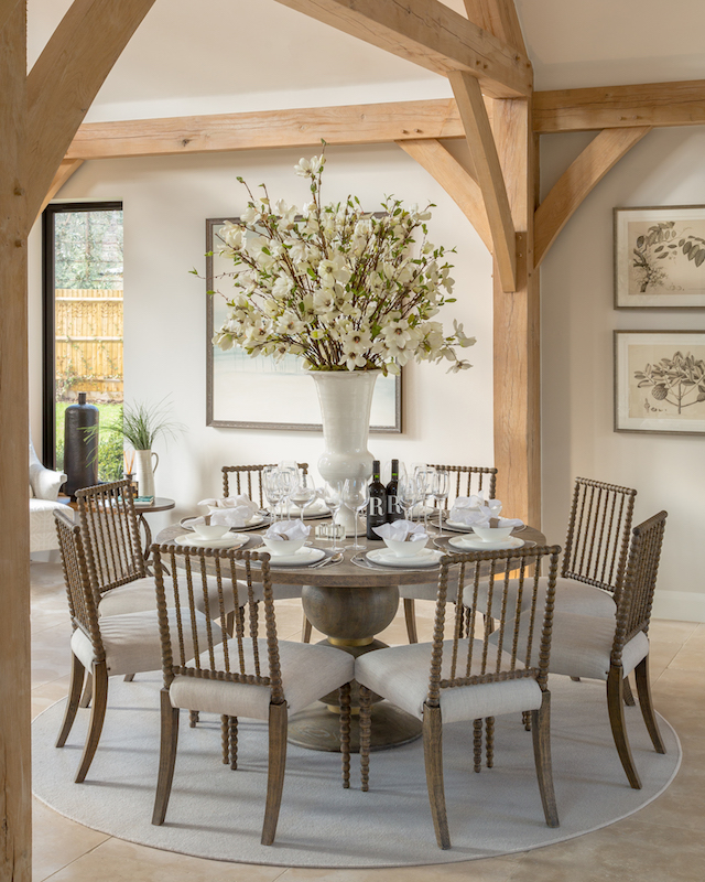 Traditional yet contemporary, these elegant bobbin chairs and dining table by Julian Chichester rest serenely beneath the high-vaulted oak beams of our rustic Surrey barn project. With ivory tones and magnificent floral display, this design is fresh, light and ethereal in its tranquility.